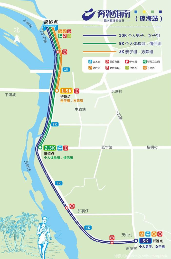 10K:万泉河广场(起点)—万泉河路(向南直行一段距离后向东直行至万泉河路与人民路交叉位置)—人民路(5K折返)—折返—万泉河路(向西行进一段距离后向南直行)—万泉河广场(终点)。